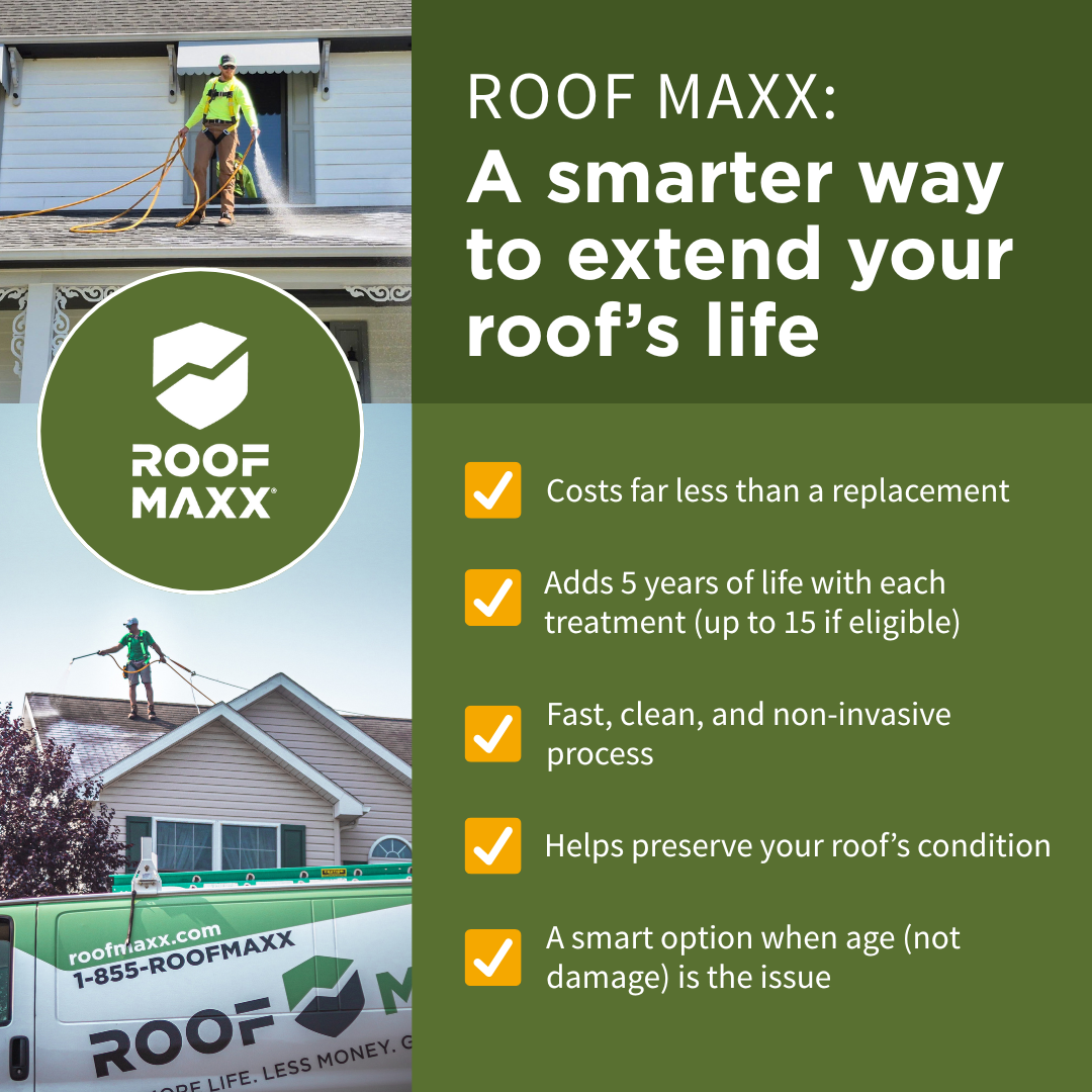 Roof Maxx is an all-natural treatment that’s guaranteed to extend the life of old roofs right away—up to 15 years with applications every five years. All for a fraction of the cost of a new roof.